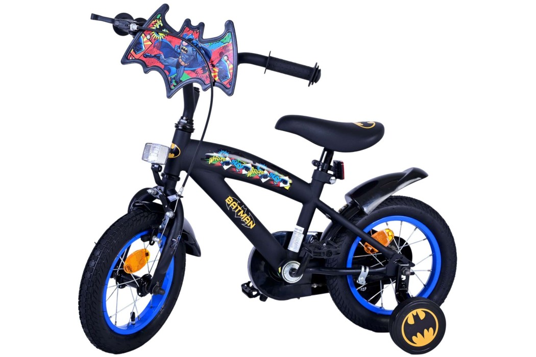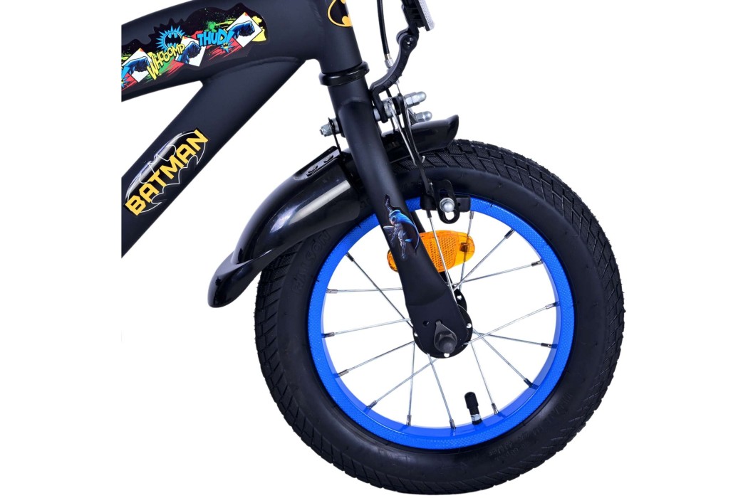 Batman-cykeln kombinerar robust design med hög komfort. Den svarta ramen med blå detaljer och ikonisk Batman-grafik tål lek och äventyr, medan de extra långa stänkskärmarna håller kläderna rena. En mjuk sadel och justerbart styre och sadel gör att cykeln kan anpassas efter barnets växande behov – vilket förlänger användningstiden.