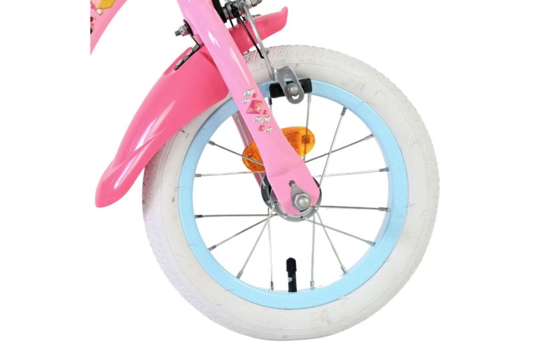Denna underbara rosa cykel kombinerar säkerhet, komfort och magisk design. Utrustad med både handbroms och fotbroms ger den extra trygghet under cykelturen, och de avtagbara stödhjulen gör övergången till två hjul enkel och rolig.