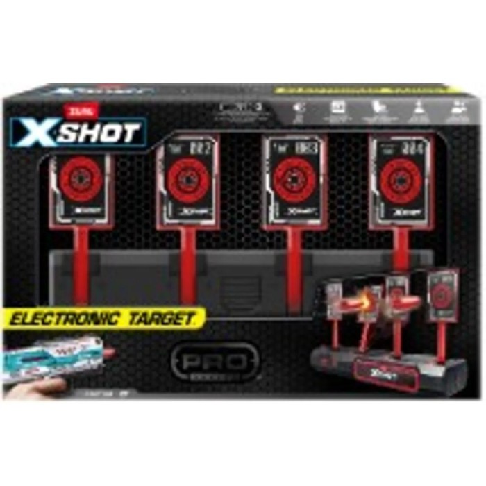 Öva upp din precision med X-Shot PRO Series Electronic Target – den ultimata piltavlan för dartblasters. Tavlan har fyra mål som automatiskt reser sig efter träff, vilket gör leken mer intensiv och realistisk. Välj mellan Free Fire Mode eller Time Attack Mode och spela ensam för att slå ditt rekord – eller utmana vänner i multiplayer-läge. Med ljudeffekter och LCD-display blir varje träff spännande. Piltavlan är kompatibel med alla större märken av dartblasters, vilket gör den till ett perfekt tillbehör för både nybörjare och proffs.